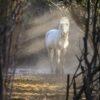 The horse stands proudly, framed by small trees, as late afternoon light filters through the dust it has stirred up, creating a mesmerizing and atmospheric scene.